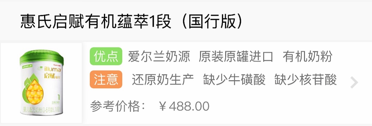 启赋有机蕴萃1段采用爱尔兰有机奶源,有机奶粉最大的优势是它对于生产原料及环境有着更严苛的要求,因此在安全方面比普通奶粉更有保障。但可惜,启赋有机蕴萃1段使用了大包粉兑水的还原奶作为奶基生产,还原奶的加工比较繁琐,奶粉受到二次污染的几率比较高,营养保留度也不太理想。
